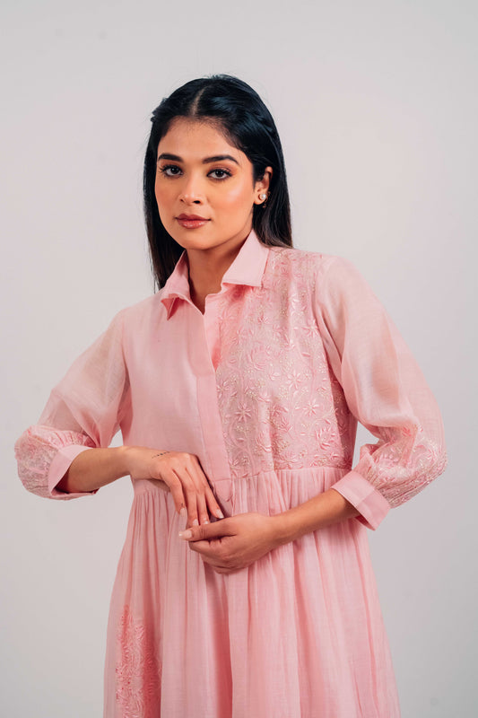 Baby Pink Mul Chanderi Gather Detail Co-Ord Set