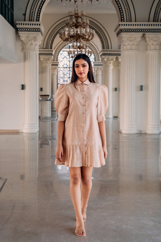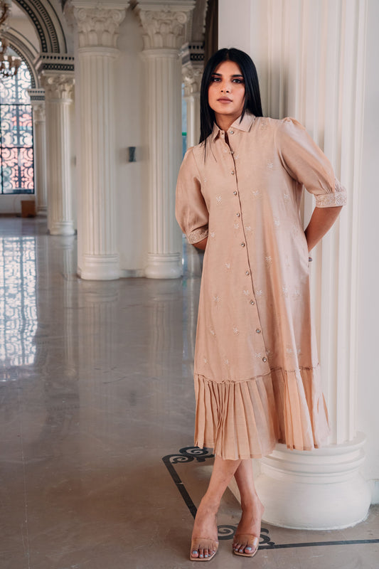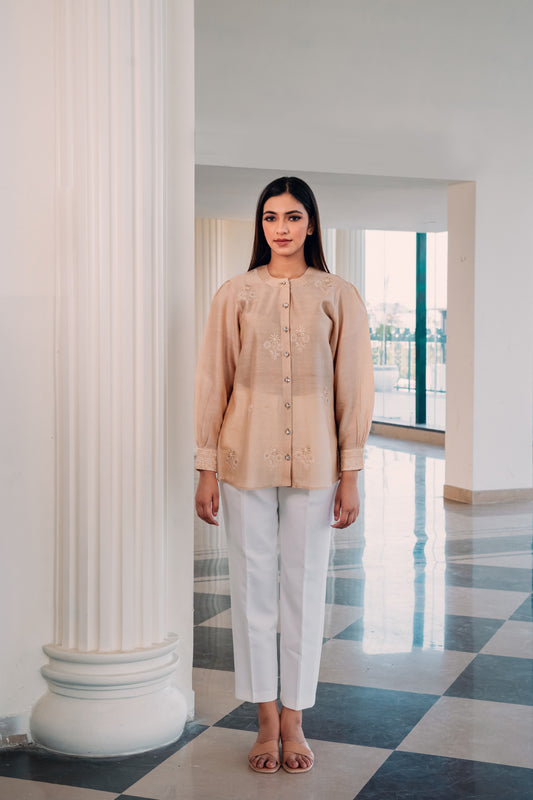Beige Chanderi Pleated Chanderi Chikankari Shirt