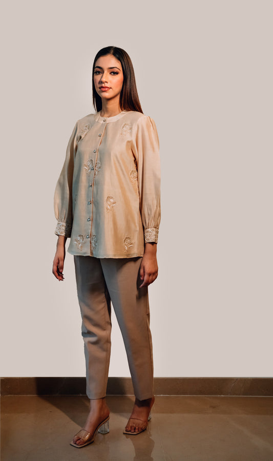 Beige Chanderi Silk Highlighted Chinese Collar Shirt