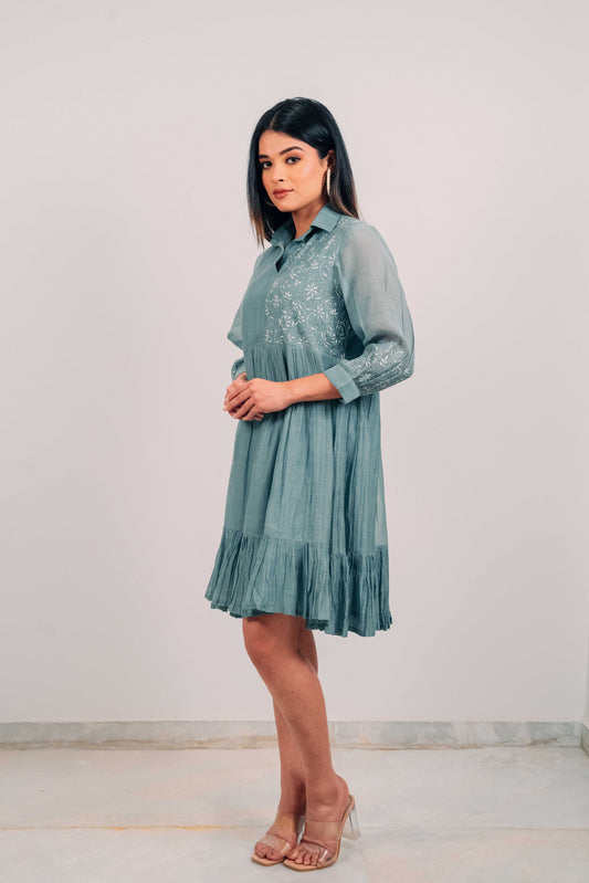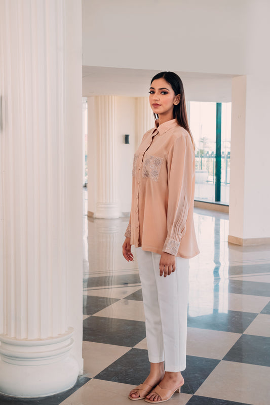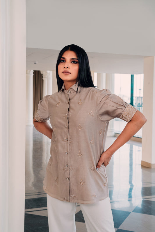 Taupe Brown Chanderi Silk Highlighted Half Sleeve Collar Shirt