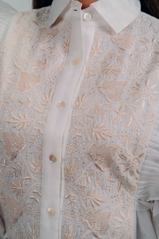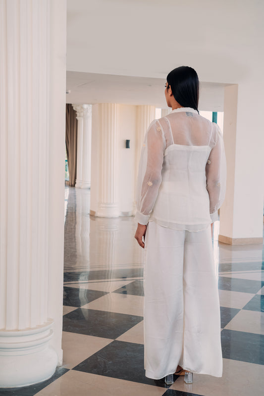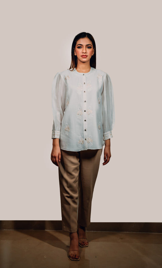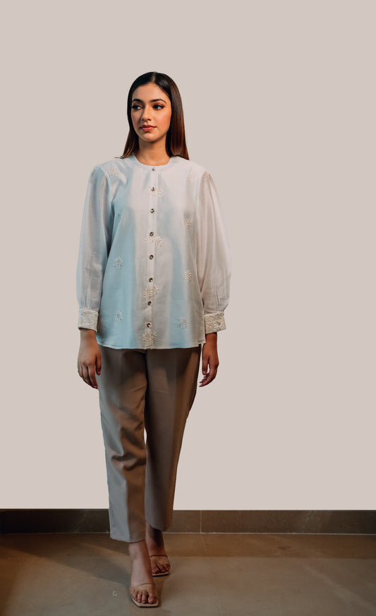 White Chanderi Silk Highlighted Chinese Collar Shirt