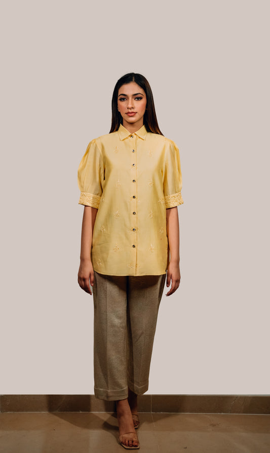 Yellow Chanderi Silk Highlighted Half Sleeve Collar Shirt
