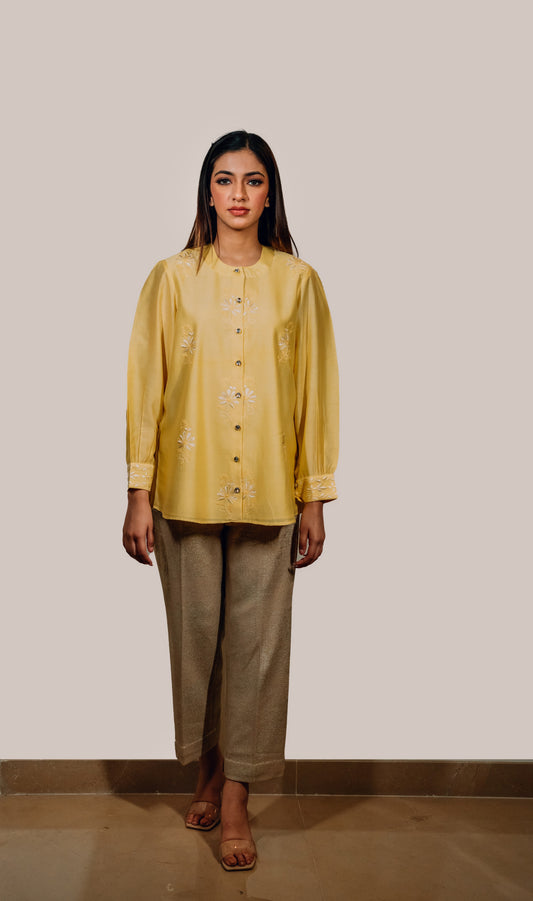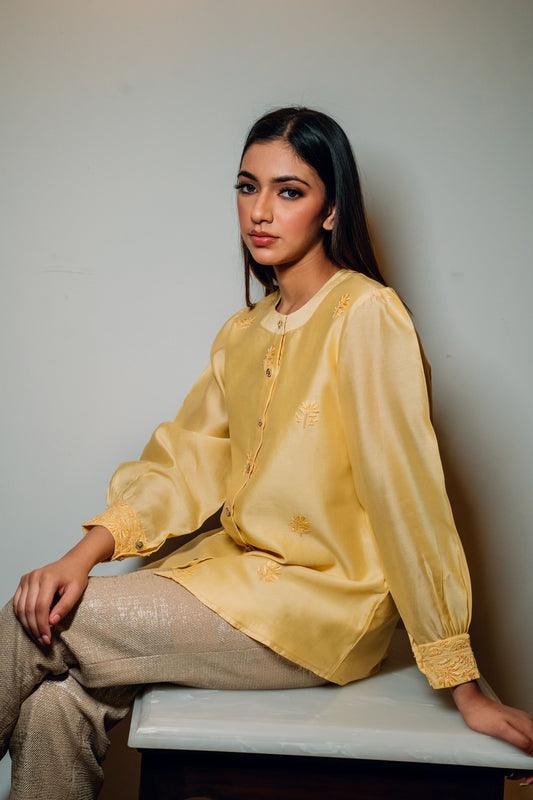 Yellow Chanderi Silk Highlighted Chinese Collar Shirt