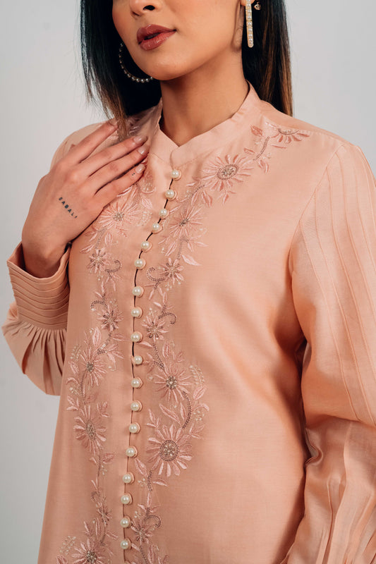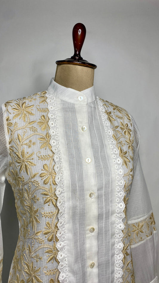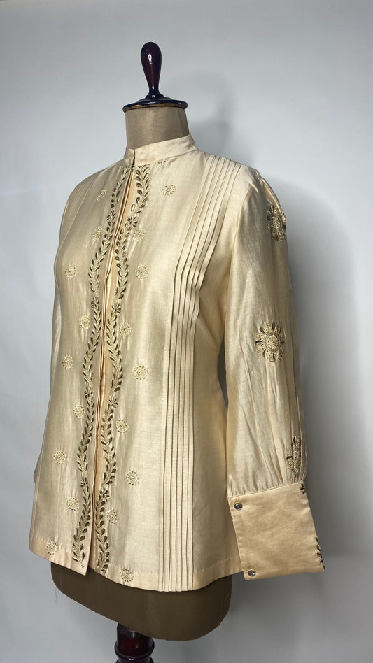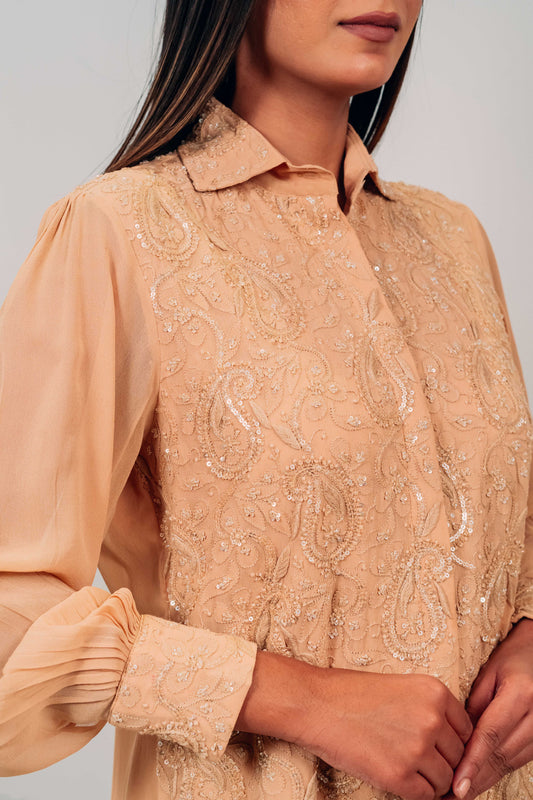 Beige Chanderi Pleated Chanderi Chikankari Shirt