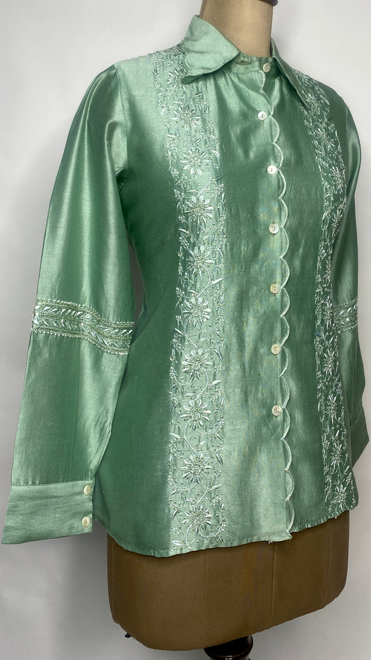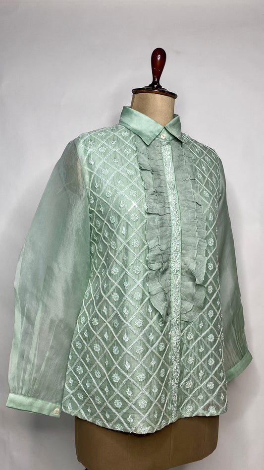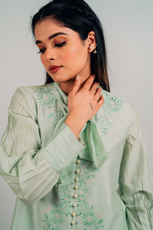 Pistachio Green Chanderi Silk Pearl Button Shirt