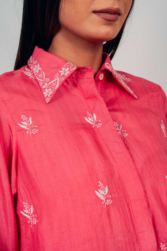 Fuchsia Pink Pure Silk Highlighted Chikankari Shirt